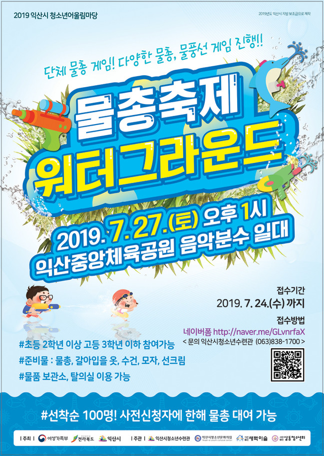 익산시 청소년어울림마당에서 진행하는‘물총축제 워터그라운드’가 오는 27일 중앙체육공원 음악분수대 광장에서 펼쳐진다.
