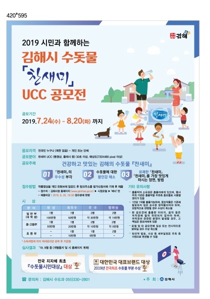김해시는 깨끗하고 안전한 수돗물에 대한 관심을 유도하고 수돗물 브랜드‘찬새미’의 이미지 제고를 위한 시민들의 참신하고 다양한 아이디어를 발굴하고자 2019 시민과 함께하는‘김해시 수돗물 찬새미 UCC 공모전’을 개최한다고 밝혔다.