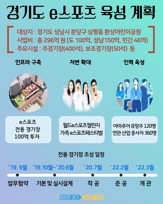 한편, 경기도는 지난해 10월 e-스포츠 산업생태계 조성을 위한 인프라 구축 e-스포츠 문화향유 및 저변확대 선수 및 연관 산업 종사자 인재육성시스템 구축 등 2019년부터 2022년까지 4년간 3개 분야 6개 사업에 총 134억 원을 투입하는 내용의 ‘경기도 e-스포츠 산업 육성계획’을 발표한 바 있다.