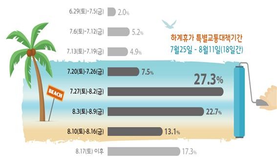 국토교통부는 오는 25일부터 8월 11일까지 18일간을 “하계 휴가철 특별교통대책기간”으로 정하고 국민들에게 안전한 교통 환경과 원활한 교통편의를 제공하기 위해 특별교통대책을 마련·시행한다고 밝혔다.
