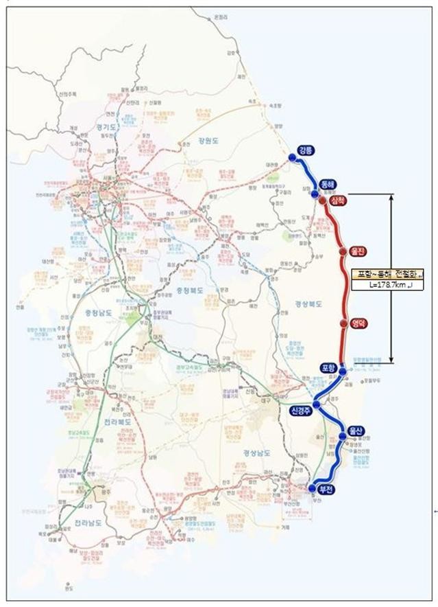 동해선(포항~동해) 전철화 노선도