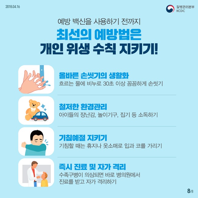 특히 수족구병 예방을 위해서는 흐르는 물에 비누로 30초 이상 손씻기, 옷소매 위쪽이나 휴지로 입과 코를 막고 기침하기 등이 중요하다.
