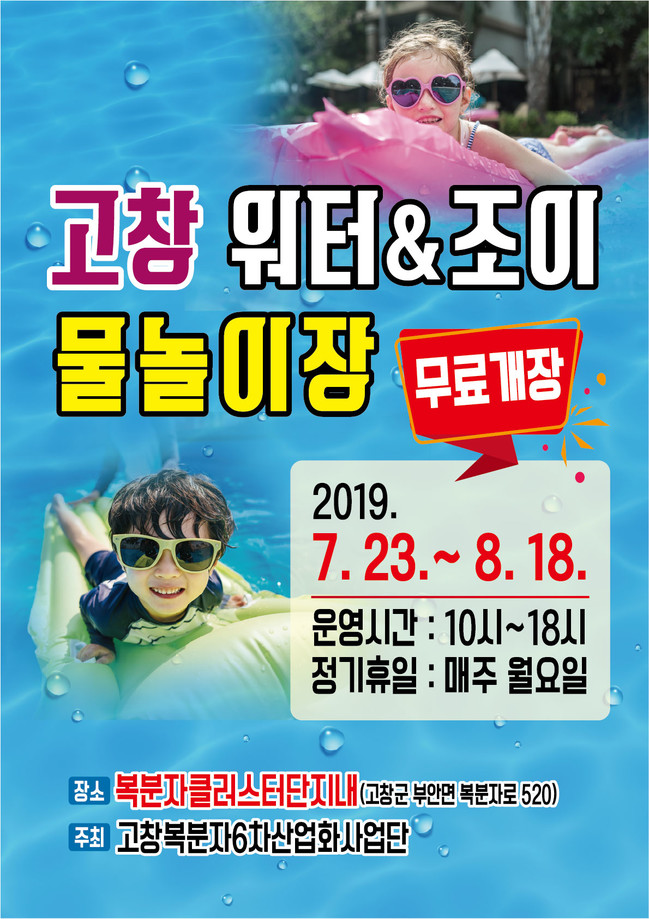 고창군은 오는 23일부터 부안면 복분자클러스터 내에 에어풀장과 물놀이시설을 갖춘 남녀노소 누구나 즐길 수 있는 야외 물놀이장 ‘워터&조이’를 운영한다고 밝혔다.