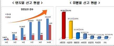 안전신고 건수는 매년 늘어나는 추세이며, 유형별로는 불법 주·정차 등 교통안전은 462,854건, 도로·건물 등 시설안전은 307,216건, 등산로·체육시설 등 생활안전은 101,356건 순으로 나타났다.