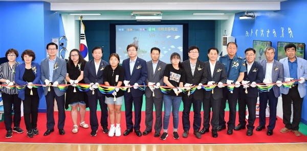 염태영 시장(왼쪽에서 일곱 번째)이 ‘영화초 가상현실 스포츠실 개관식’에서 관계자들과 함께 테이프 커팅을 하고 있다.
