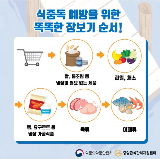 휴가철 음식 장만을 위한 ‘똑똑한 장보기 순서’는 ①쌀, 통조림 등 냉장이 필요 없는 제품을 우선 구입하고, ②과일, 채소를 고른 후에, ③햄과 요구르트 등 냉장 가공식품, ④육류, 어패류 등의 순으로 구입하는 것이 좋다.