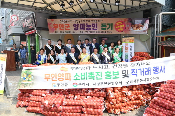 구리시는 지난 22일 구리전통시장 공영주차장 보이는 라디오 무대에서 ‘구리전통시장-무안군 지역 경제 상생을 위한 무안 농촌 돕기 행사’를 개최했다. 이번 행사는 최근 양파 작황 호조에 따른 공급 과잉으로 양파 가격이 폭락함에 따라 생계에 어려움을 겪는 무안 지역 농민들을 지원하기 위한 행사였다. 이를 위해 구리시는 시 직원 및 유관 단체 등을 대상으로 사랑의 양파 사주기 행사를 전개한 것이다.