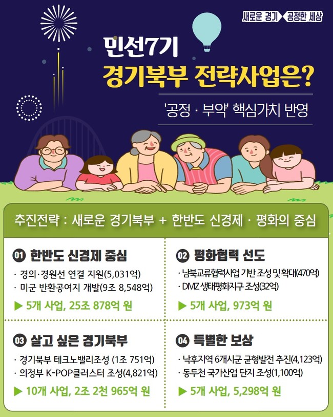 민선7기 경기도가 경기북부를 ‘한반도 신경제·평화의 중심’으로 만들기 위해 오는 2022년까지 4개 분야 25개 사업에 총 28조원을 투자하기로 했다. 도는 이를 통해 38조원 규모의 생산유발 효과와 26만명의 일자리 창출 효과가 발생할 것으로 전망하고 있다.