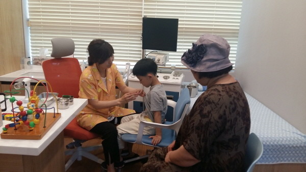 11일 함소아한의원(강동지점)에서 아동의 호흡기 강화를 도와줄 한방패치를 붙여주고 있다.