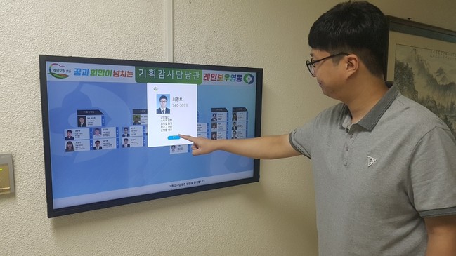이에 군은 업무방식을 내부행정시스템과 연계해 자동으로 표출되도록 했고 43인치 대형 모니터로 설치해 시인성을 좋게 하였으며 직원을 터치하면 더 크게 그리고 더 자세한 담당업무까지 볼 수 있도록 했다.