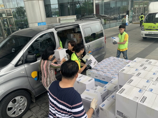 15일 금천구청 광장에서 금천구가 ‘(사)희망을 나누는 사람들’이 후원한 물품을 관내 복지시설 등에 배분하고 있다.