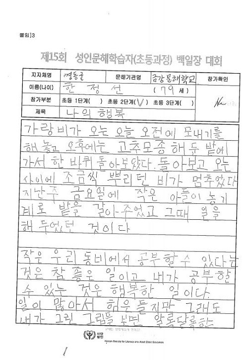 우수상 수상자 손병분 씨는 “한평생 깨 농사만 지으며 글 모르는 서러움에 답답하게 살아왔는데 검정깨알처럼 여겼던 글씨가 지금은 그 무엇과도 바꿀 수 없는 보석 같은 ‘황금깨알’이 됐다”며 환한 미소로 행복의 소감을 전했다.