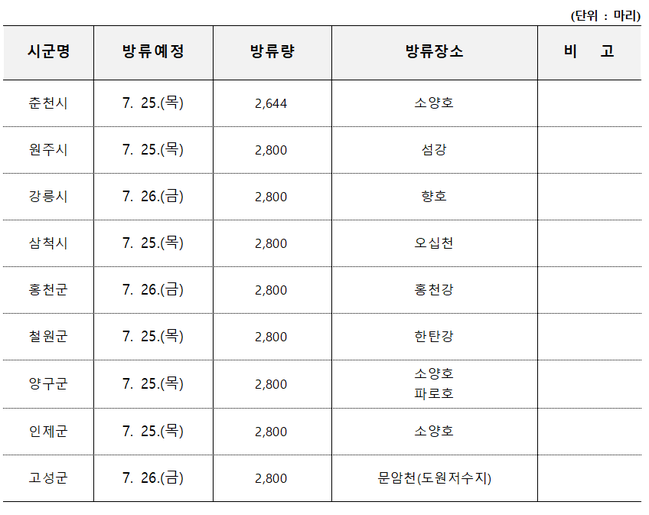강원도내수면자원센터는 내수면 고부가가치 어종인 뱀장어 어린고기 25천마리를 오는 25일부터 26일까지 춘천시 외 8개 시군에 분산 방류한다고 밝혔다.