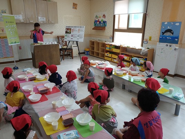 바른식생활지도사 1급 자격증을 취득한 24명의 생활개선회원은 관내 양로원 등 5개소를 방문해 ‘식품구성자전거’, ‘컬러푸드’ 등 화판을 활용한 바른식생활 이론교육과 어린이, 어르신, 결혼이민자여성, 장애인 등 대상에 맞는 실습교육을 진행하고 있다. 지난 18일에는 신북어린이집을 방문해 5~7세 어린이 20여명을 대상으로 ‘떠먹는 컵피자’를 만드는 재능기부 활동도 펼쳤다.