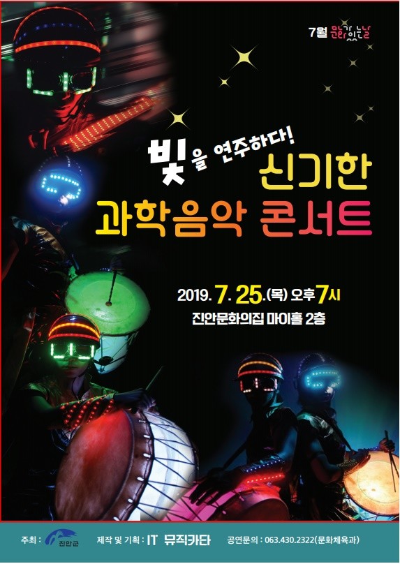 진안군은 7월 문화기획 공연으로 ‘IT국악밴드 카타의 신기한 과학음악 콘서트’를 오는 25일, 오후 7시 진안문화의집 마이홀 무대에 올린다.