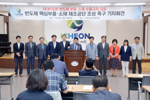 엄태준 이천시장은 23일 시청 1층 대회의실에서 일본 정부의 반도체 부품·소재 수출규제 조치에 따른 ‘반도체 핵심부품·소재 제조공단 조성 촉구’기자회견을 가졌다.