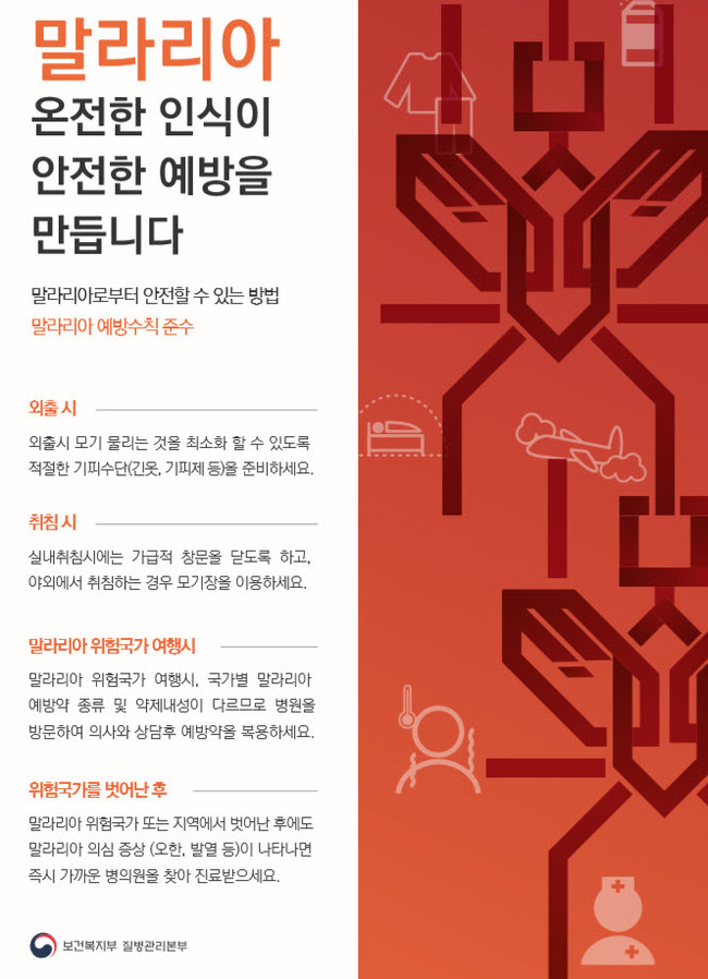 더불어, 현재 예방백신이 없는 말라리아 등 모기매개 감염병 예방을 위해 모기에 물리지 않도록 ‘말라리아 예방수칙’ 준수를 당부했다.