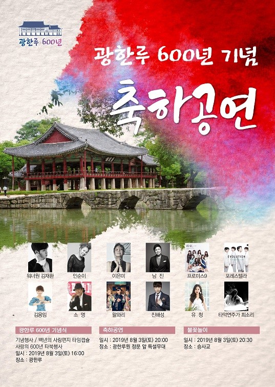 저녁 8시에는 광한루앞 차없는 거리에서 남북정상회담 표지석을 쓴 효봉 여태명 작가의 붓글씨 퍼포먼스가 눈길을 사로잡는다. 가수 인순이, 남진, 김용림, 포레스텔라와 인기 아이돌 그룹 등이 참여하는 축하공연과 불꽃놀이도 광한루 600년의 여름밤을 뜨겁게 달굴 것이다.