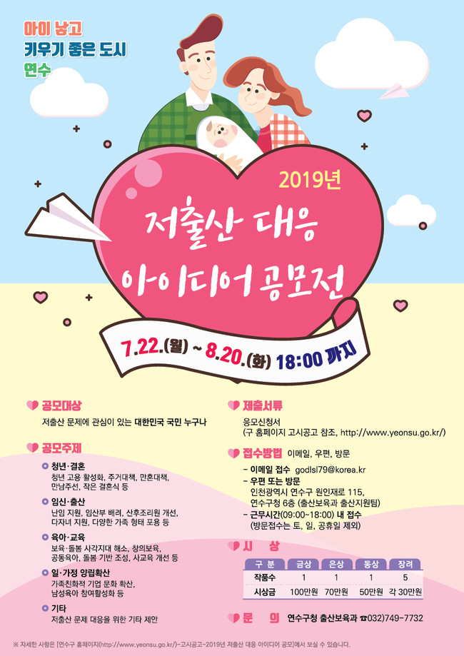 연수구는 갈수록 심화되고 있는 저출산 문제에 대응 할 수 있는 국민들의 다양하고 참신한 아이디어를 정책수립에 반영하고자 ‘2019년 저출산 대응 아이디어 공모전’을 실시한다.
