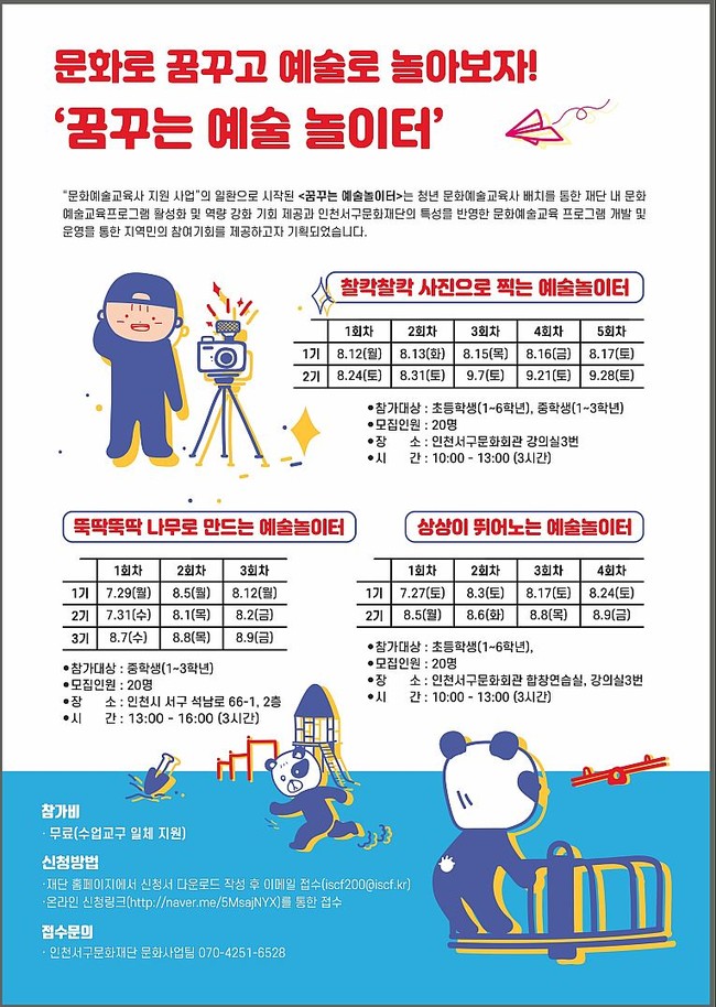 인천서구문화재단은 여름 방학 기간을 맞은 관내 아동 청소년을 대상으로 한 다양한 예술 교육프로그램을 마련했다.