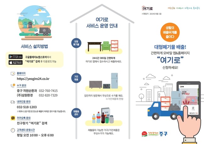 대형폐기물 간편 배출 서비스는 중구 홈페이지에서 ‘대형폐기물 처리’를 검색 후 연계된 링크를 클릭·접속하거나 https://yeogiro24.co.kr로 직접 접속할 수 있으며, 스마트폰에서는 구글 플레이나 앱 스토어에서 ‘여기로’ 검색 후 다운로드해 폐기물 종류 및 배출날짜 등 배출 정보를 입력한 후 수수료를 납부하면 간편하게 대형폐기물을 배출할 수 있다.