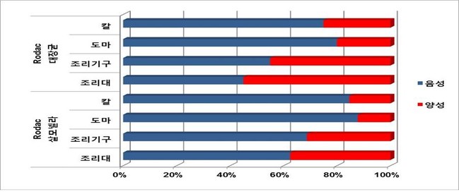 미생물 배지 검사 결과 칼·도마·조리기구·조리대에서 대장균 62%, 살모넬라 30% 정도가 양성 반응이 나왔다. 조리 기계·기구류는 세척, 소독방법을 개선하고 주기적인 자체 점검이 필요하다.