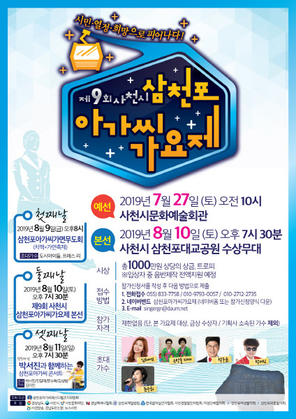 이에 앞서 오는 27일 오전 10시 사천시문화예술회관에서는 삼천포아가씨가요제 예선전을 통해 본선참가자를 선발할 예정이다. 참가 신청은 26일까지 전화접수와 네이버밴드로 할 수 있다.