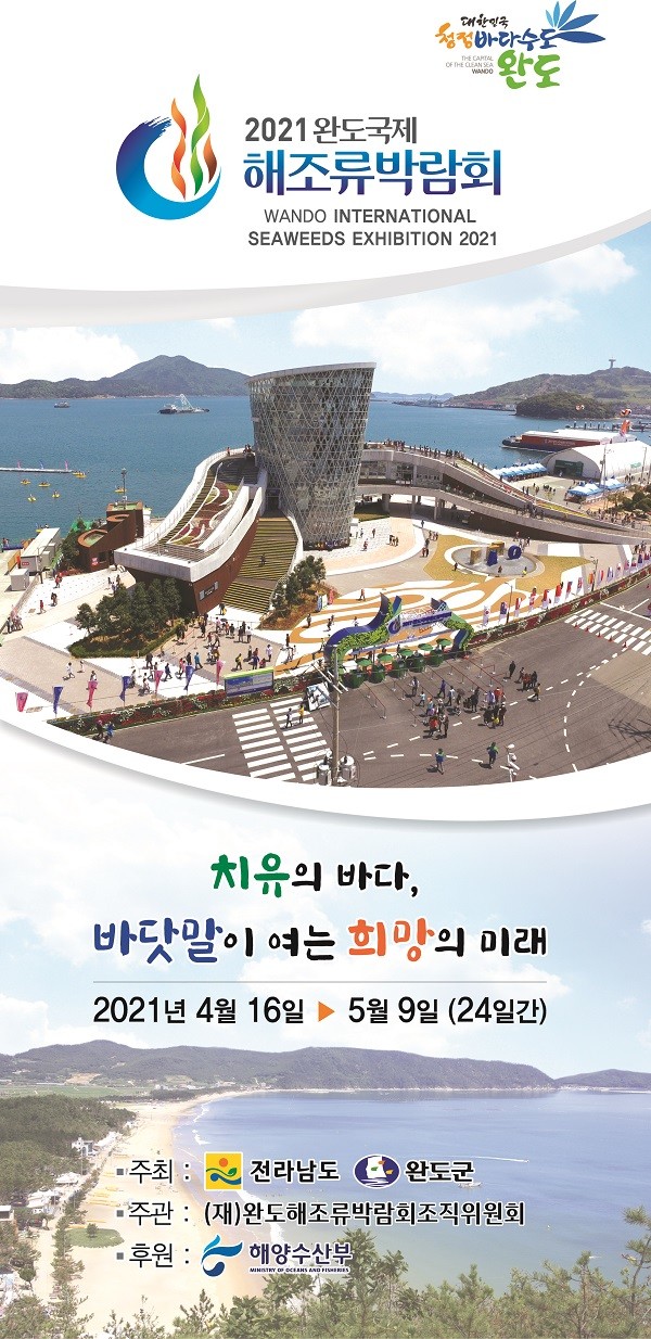 2021완도국제해조류박람회는 21년 4월 16일부터 5월 9일까지 ‘치유의 바다, 바닷말이 여는 희망의 미래’라는 주제로 완도항 해변공원 일원과 명사십리 해수욕장 부행사장에서 개최한다.