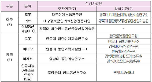 다음으로 경북과제로 인공지능, 바이오, 로봇, 미래차 분야의 총 4개 사업단이 선정되었으며 인공지능·소프트웨어 분야의 주관기관인 포항공과대학교 정보통신연구소는 우수한 전문 교수진과 자원을 활용해 경북인공지능거점센터 내 지역기업 인재양성교육과정, 포스코·삼성전자·에스케이하이닉스 등 기업맞춤형교육과정, 취업준비생 대상 사회공헌 프로그램인 청년 인공지능·빅데이터 아카데미를 운영 중인 국내 최고의 인공지능 교육기관으로서 참여기관인 포항테크노파크와의 협력을 통해 경북 지역 기업수요 맞춤형 전문역량 교육을 실시할 예정이다. 4차 산업혁명의 핵심분야 중의 하나인 인공지능 인재 유치를 통해 지역의 인공지능 우수 기업의 경쟁력 확보가 기대된다.