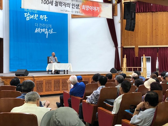 ‘100세 철학자의 인생, 희망이야기’를 주제로 진행된 이날 강연에는 대한민국 철학계 1세대 교육자이자 연세대학교 명예교수로 30여년을 재직한 김형석 교수가 강연자로 나섰다. 김 교수는 100세의 나이에도 불구하고 전국을 무대로 활발한 강연과 수많은 저서를 집필하는 등 왕성한 활동을 이어가며 ‘100세 시대의 롤모델’로 평가받고 있다.