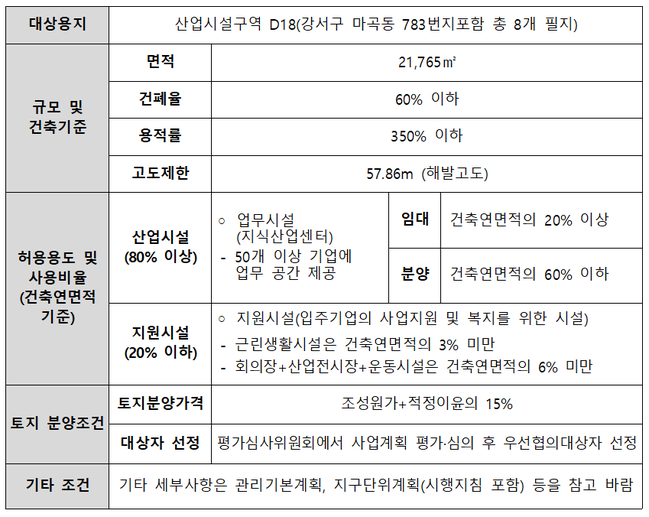 공모에 참여를 원하는 사업자는 부동산개발업을 등록한 자이면서 마곡산업단지 관리기본계획에서 허용하는 업종 외 부동산임대업, 부동산공급업 또는 부동산신탁업을 업무로 하고 있는 자이어야 한다.