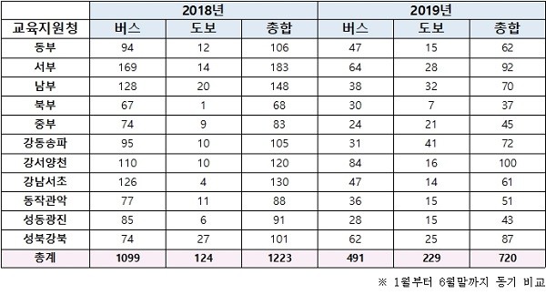 국회 교육위원회 김현아 의원이 서울시 교육청으로부터 제출받은 ‘서울시 공립유치원 현장학습 현황’에 따르면 올해 현장학습체험 건수는 전년 동기 대비 720건으로 전년도 1,223건에 비해 41%나 감소했다. 버스를 이용한 현장학습체험 건수는 491건으로 무려 44%나 감소했으며, 도보 건수는 229건으로 84%가 증가했다. 버스를 이용한 현장체험이 취소되거나 도보로 대체된 것이다.