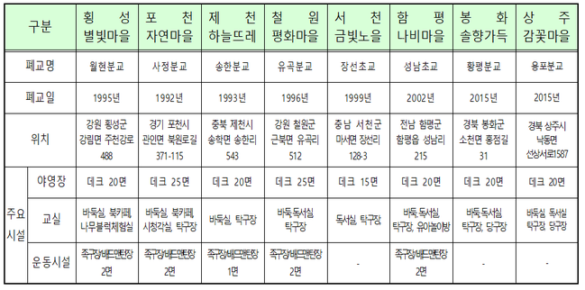 한편 서울시는 2013년부터 도농상생 협력과 서울시민들이 도시를 벗어나 자연을 체험할 수 있도록 8개 지역의 지방 폐교를 활용해 가족캠핑장을 운영하고 있다.