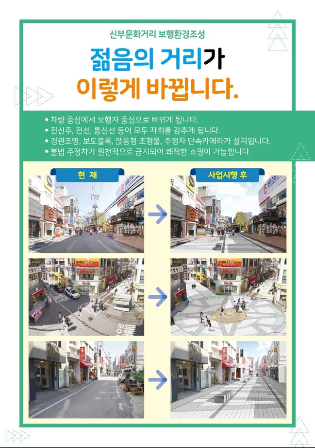 신부문화거리 보행환경조성사업은 보행 친화적 바닥 포장재 재질을 변경하고 앉음형 조형물 설치, 주정차 금지 추진 등으로 보행자 전용도로를 확대하는 것이 골자다.