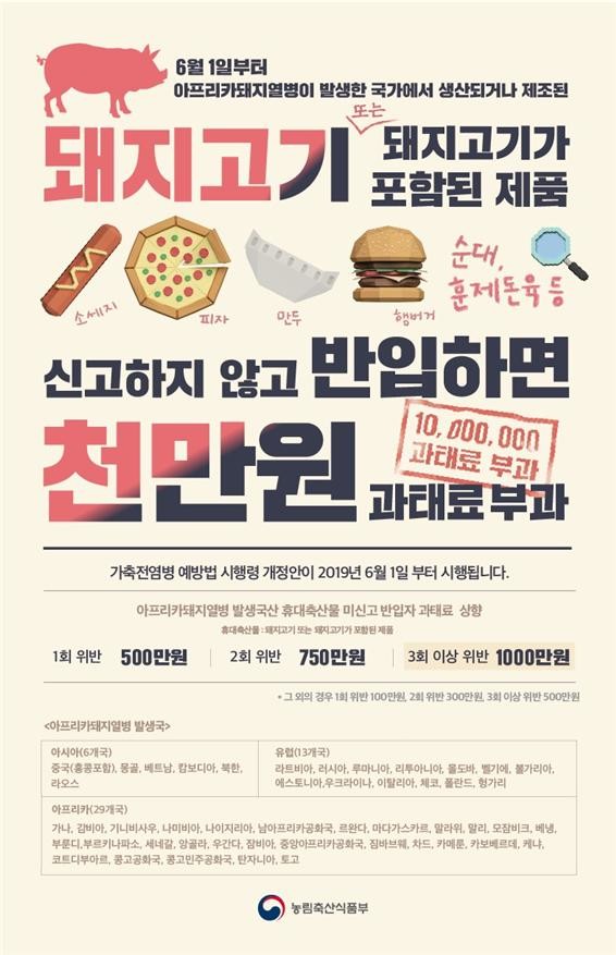이와 더불어 관세청은 중국, 몽골, 베트남, 캄보디아, 라오스 등에서 아프리카 돼지열병이 지속적으로 발병하고 있어, 국내유입 방지를 위해 축산물 및 축산물 가공품을 절대 반입하지 말아 줄 것을 당부했다.