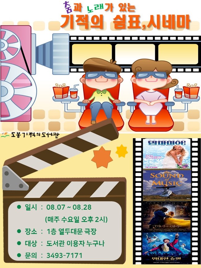 8월 한 달간 매주 수요일 오후 2시 도봉기적의도서관 1층 열두대문극장에서는 남녀노소 누구나 즐길 수 있는 유명 뮤지컬영화를 상영하는 ‘춤과 노래가 있는 기적의 쉼터 시네마’를 운영한다.