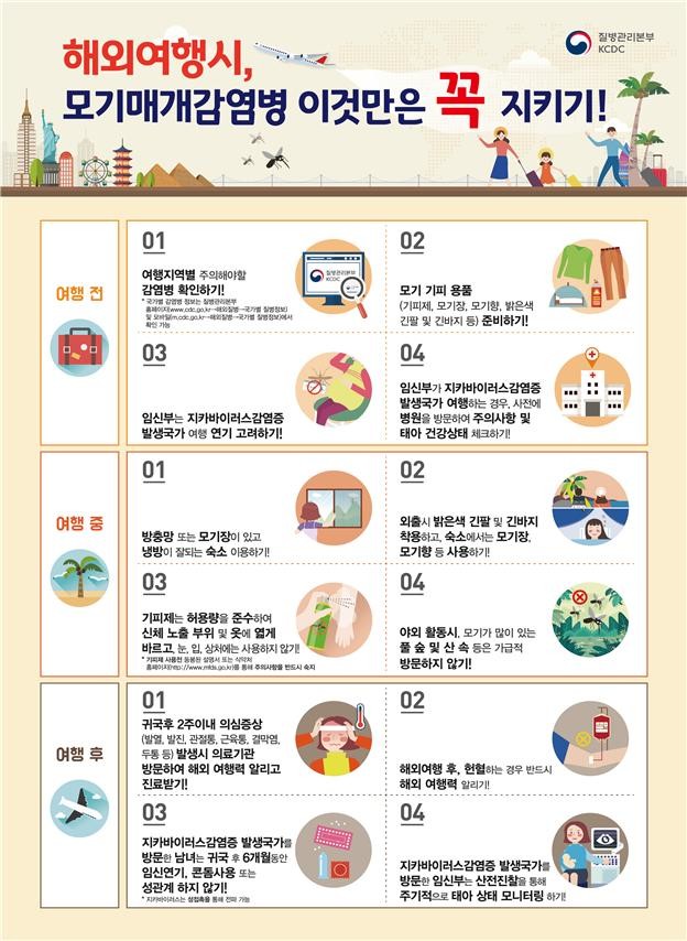 또 모기에 물리지 않도록 유의하고 특히 임신부는 지카바이러스감염증 유행국가 여행을 자제해야 한다. 발생국을 다녀온 여행객은 남녀 모두 6개월간 임신을 연기해야하고, 말라리아 유행 국가 여행 시 말라리아 예방약 복용이 권고된다.