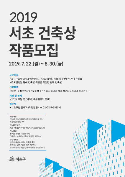 서울 서초구청은 건축의 공공적 가치 구현과 도시 미관을 향상 시키는 우수 건축물을 선정하고, 이에 기여한 분들에게 감사의 시상을 하고자 내달 31일까지 ‘2019 서초 건축상’ 작품을 공모한다.