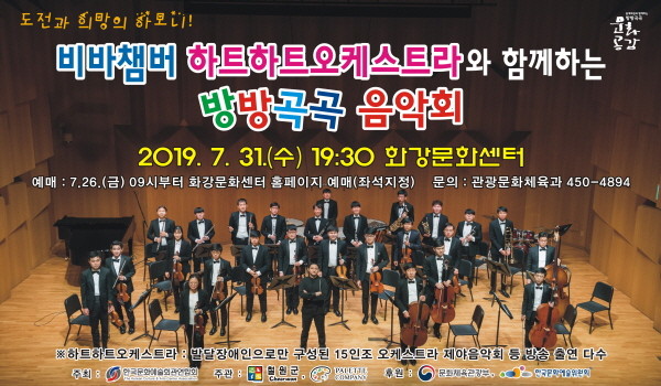 문화가 있는 날 주간인 31일 오후 3시, 오후 7시 30분에 화강문화센터에서 하트하트오케스트라의‘방방곡곡 음악회’를 개최한다. 하트하트오케스트라는 발달장애인으로만 구성된 15인조 오케스트라로서, 뉴욕 카네기홀 등 800여회의 국내외 연주를 통해 실력을 입증하며 장애인식개선 활동에 앞장서고 있다.
