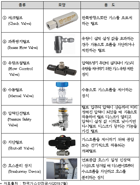 제품 종류에는 체크밸브, 과류방지밸브, 유량조절밸브, 수동밸브, 압력안전밸브, 차단밸브, 호스분리 장치가 있다.