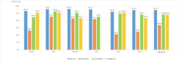 생후 36개월 어린이의 예방접종률을 해외 국가와 비교한 결과를 보면, 우리나라 예방접종률은 평균 97.2%로 외국 예방접종률 대비 평균 3~10%p 높았으며, 소아마비, 홍역등 비교대상 6종 백신에 대한 전체 접종률도 가장 높게 나타났다.
