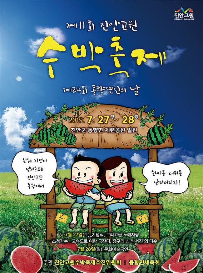 제11회 진안고원 수박축제가 오는 27일과 28일 2일간 진안군 동향면 체련공원에서 열린다. 제24회 동향면민의 날 행사와 함께 열리는 이번 수박축제는 ‘천혜의 자연이 넘쳐 흐르는 진안고원에서 한여름 더위를 날려버리자’는 주제로 펼쳐진다.