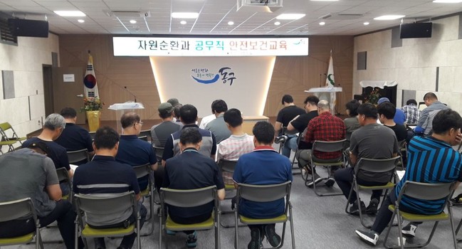 인천 동구는 지난 23일, 동구 대회의실에서 폭염과 기습호우가 기승을 부리는 여름철을 맞아 야외에서 작업을 하는 도로환경미화원의 사고 예방을 위한 특별 안전교육을 실시했다고 밝혔다.