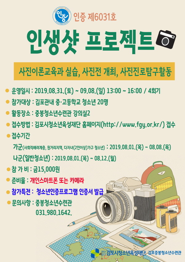 김포시청소년육성재단 중봉청소년수련관이 청소년수련활동인증 제6031호 ‘인생샷 프로젝트’ 프로그램 참가자를 모집 한다.
