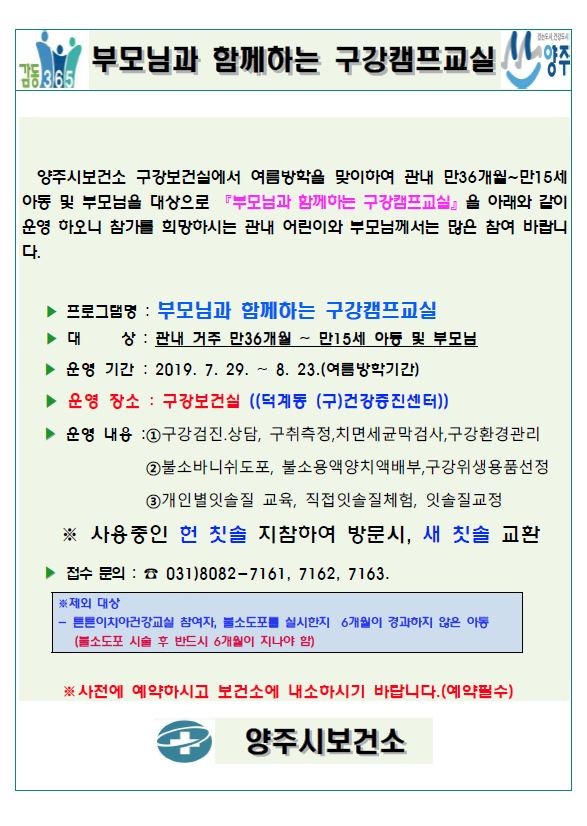한편, 양주시는 시민의 구강보건 향상을 위해 기존 보건소 내 구강보건실을 덕계동 소재 건강증진센터로 이전하고 7월 29일부터 보다 효율적인 구강보건사업을 추진한다.