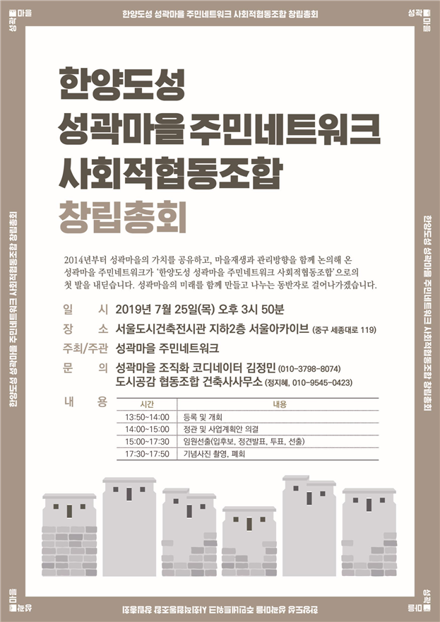 서울시는 오는 25일 오후 3시, 서울도시건축전시관에서 성곽마을 주민네트워크 주민이 각자 출자해서 참여하는 “한양도성 성곽마을 주민네트워크 사회적 협동조합” 설립을 위한 창립총회를 개최한다고 밝혔다.