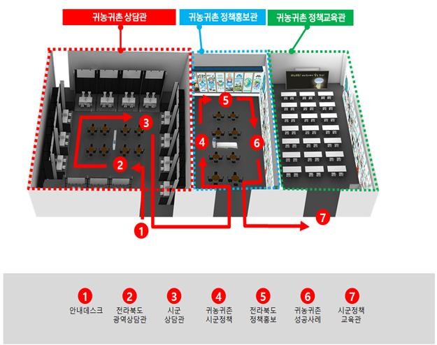 전북도 정책 홍보관에서는 전라북도에서 실시하는 농업·농촌 정책 소개를 통해 농업을 계획하고 준비하는 귀농·귀촌의 최적지로서 도시민들에게 전라북도를 알리고 홍보할 예정이며,시·군 귀농귀촌 홍보관에서는 산재되어 있는 정보를 한자리에서 비교 분석함으로써 귀농귀촌 수요자들에게 맞춤형 정보를 제공할 수 있도록 시군별 대표작물과 귀농귀촌 정책, 임시 거주시설 현황 및 의료·교육·복지환경 등 귀농귀촌 정보를 분석 한 종합정보를 제공한다.