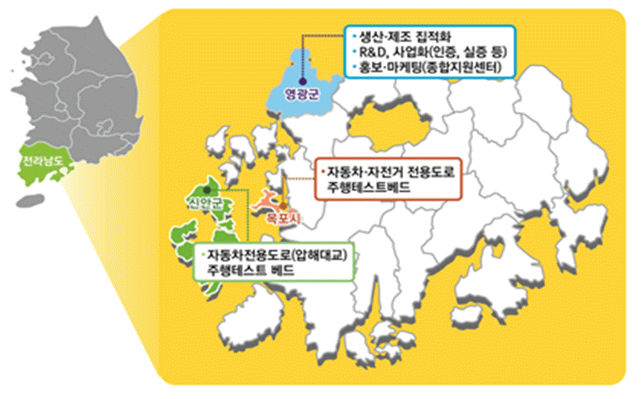전라남도는 2012년부터 영광 대마산단 일원에 e-모빌리티 산업을 선도적으로 육성해 전국에서 유일하게 실외테스트베드, 충돌시험장 등 e-모빌리티 개발, 평가, 인증, 실증에 필요한 산업 인프라를 갖췄다. 자동차부품연구원의 e-모빌리티 연구센터 등 관련 기관과 기업이 집적화돼 있다. 앞으로 설계부터 생산, 해외 진출까지 전주기 기업 지원 프로세스를 체계적으로 구축하고, 자율주행 실증 테스트베드와 미래첨단 운송기기산업 발전에 필요한 인프라를 갖춰 명실상부한 글로벌 e-모빌리티 중심지로 도약한다는 목표다.
