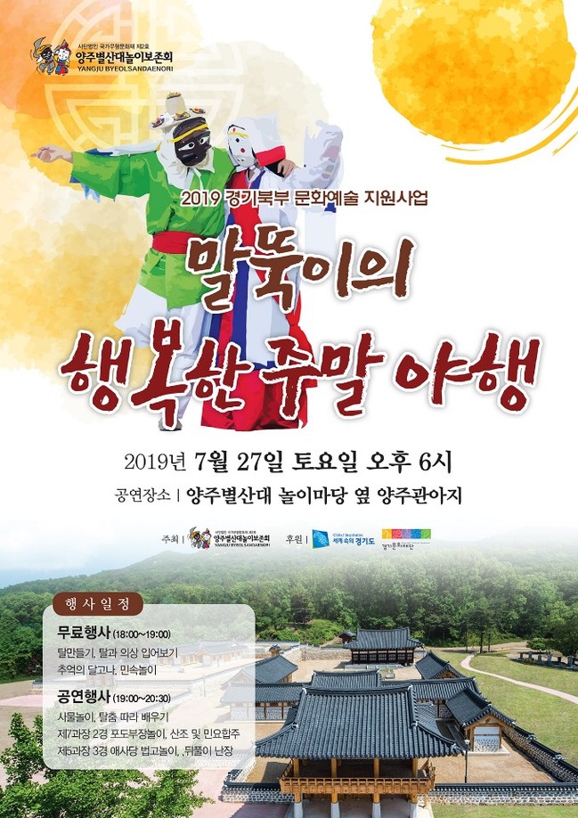 사)국가무형문화재 양주별산대놀이보존회는 오는 27일 오후 6시 양주목관아 일원에서 양주별산대놀이 기획공연 ‘말뚝이의 행복한 주말야행’을 개최한다.