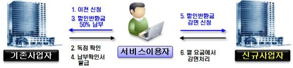 할인반환금 감면절차는 이용자가 기존 서비스를 해지할 때 할인반환금 50%를 납부하고 납부확인서를 신규 사업자에게 제시하면 신규 사업자가 서비스 요금에서 이용자가 납부한 할인반환금 50%를 감면 처리하게 된다.